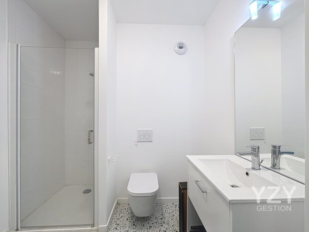 - Une salle d'eau moderne avec douche, meuble vasque, miroir lumineux, WC suspendu et sèche-serviettes.